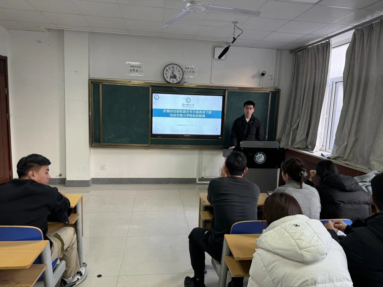 2024级社会体育与指导专业研究生马丙淞汇报的题目为《护踝对功能性踝关节不稳患者下肢运动生物力学特征的影响》本文通过分析FAI患者佩戴半刚性、弹性护踝及无护踝进行步行和跑步时下肢运动学、动力学和能量吸收的差异,进而评价护踝的急性干预效果,以期为FAI患者护踝的选择提供理论依据。