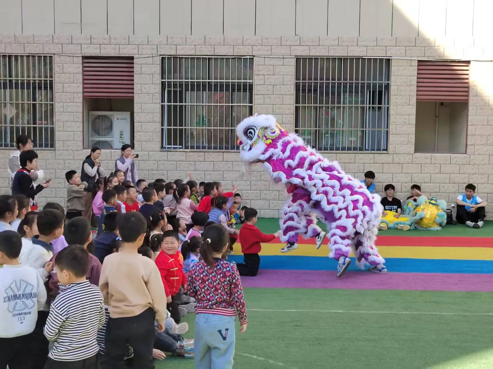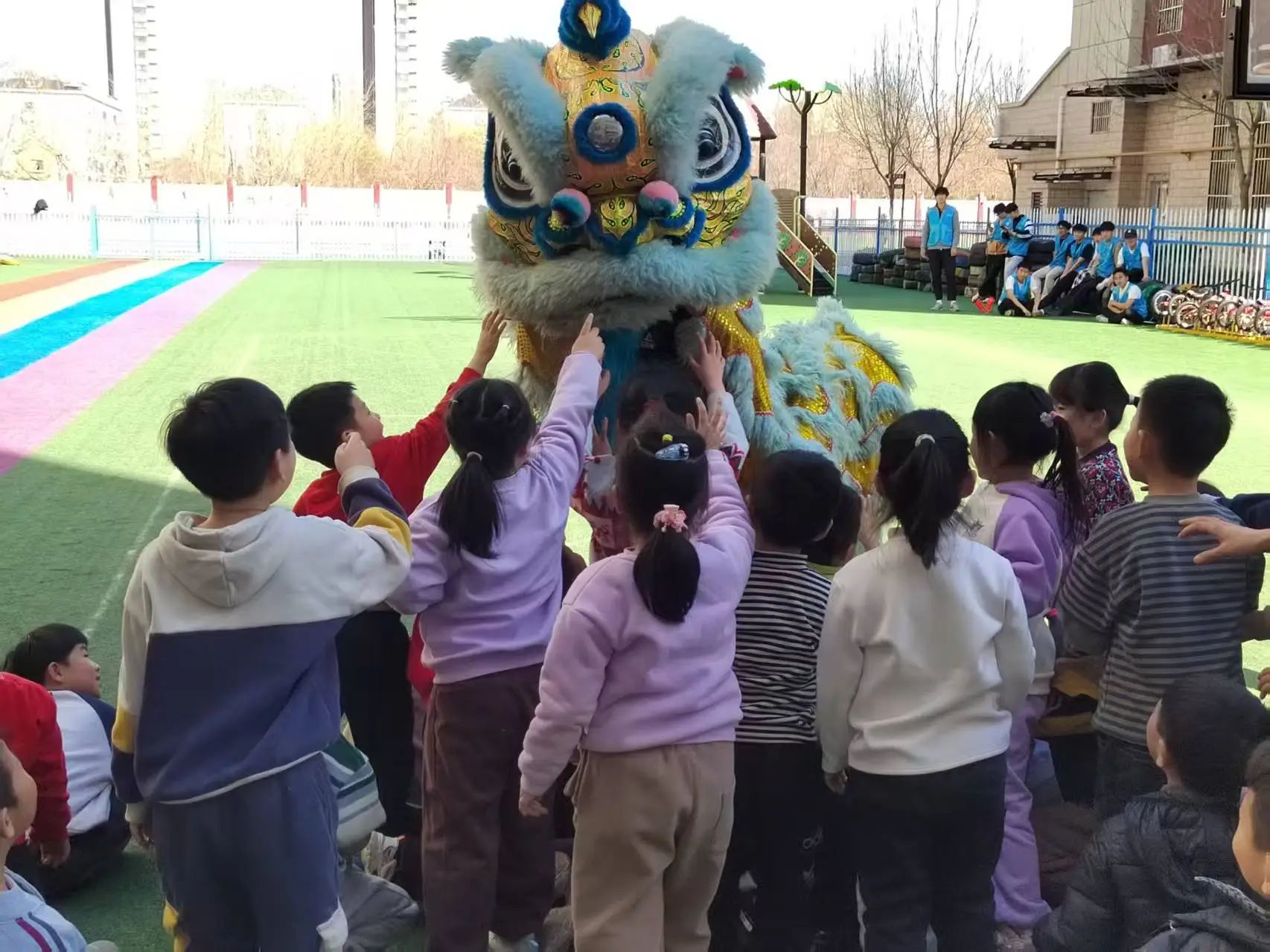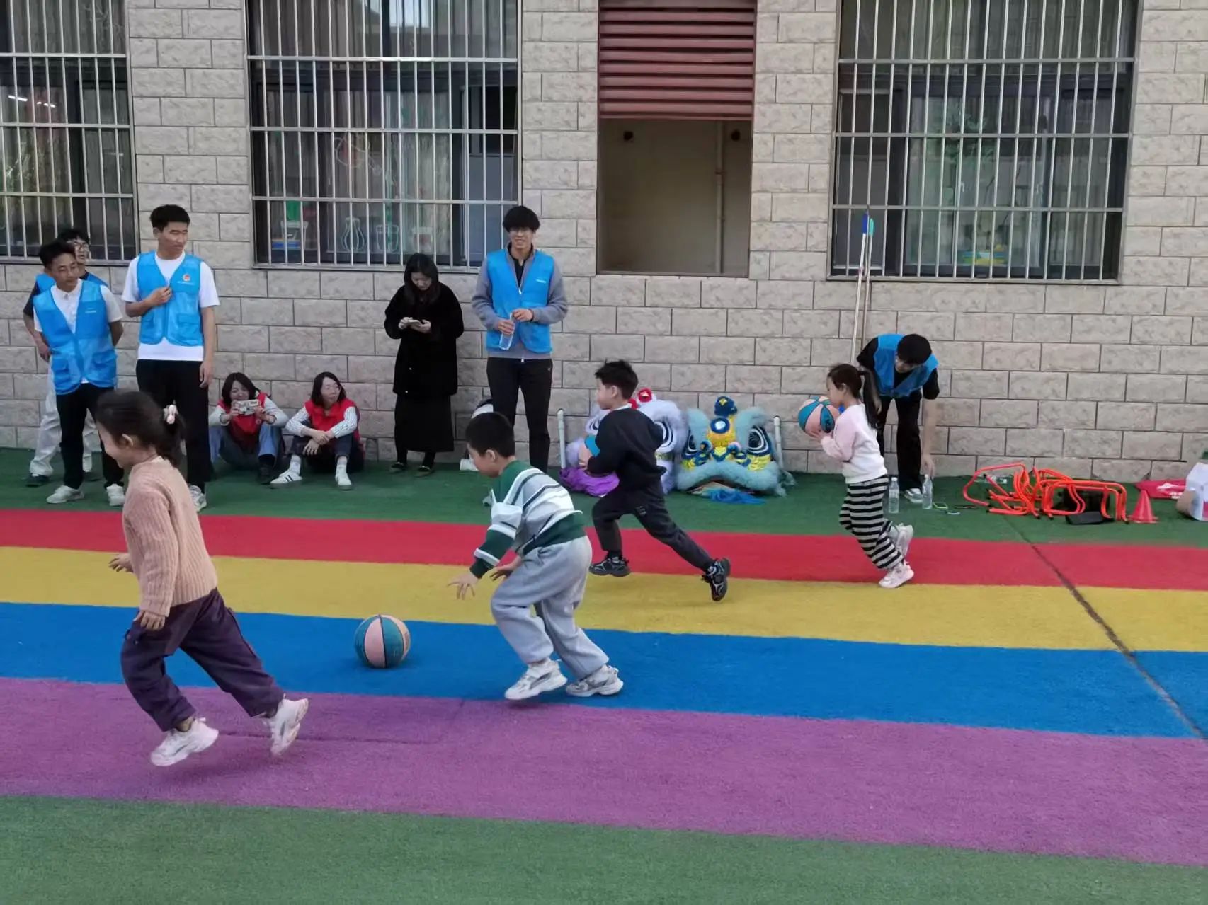 活动当天负责人先向孩子们讲了几个有关传统节日的故事,让孩子们感受到传统文化的魅力。随后,跆武龙狮社团带来了精彩的舞狮表演。锣鼓声响起,狮子在场地中央跳跃翻滚,瞬间点燃了现场的气氛。表演结束后,舞狮者邀请孩子们上台近距离观察和触摸舞狮道具,并耐心地教他们一些简单的舞狮动作。接下来,孩子们被分成若干小组,参与舞狮小游戏。在游戏中,他们需要相互配合,完成一些简单的舞狮动作。除了舞狮活动,现场还安排了传篮球游戏,教练们耐心地向孩子们讲解传球的基本技巧,孩子们在教练的带领下,逐渐掌握了动作要领,游戏过程中,笑声和欢呼声此起彼伏,现场气氛十分活跃。