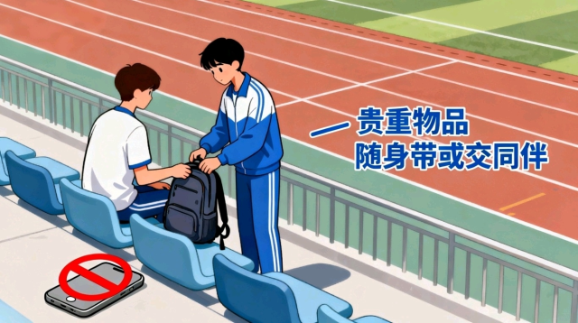 1. 运动场地别“留白”:去田径场、体育馆训练时,背包、手机等贵重物品要随身携带,或交给同行伙伴看管,切勿随意放在台阶、看台等无人区域。