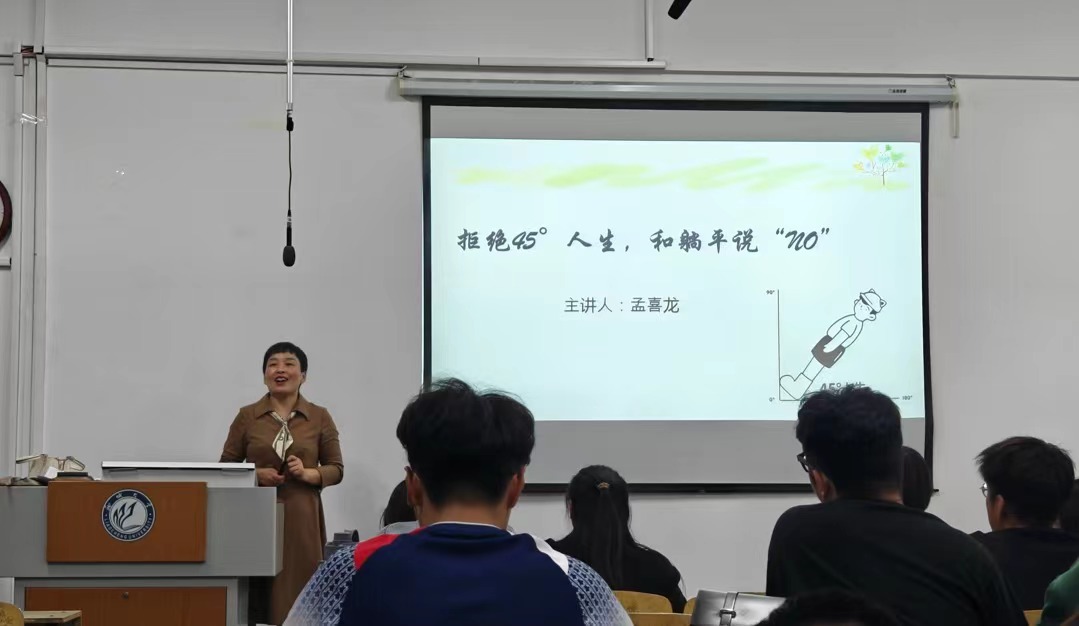 讲座中间穿插适应能力手臂测量法心理体验游戏,调研大家适应能力以及对现实的满意度,同时增强了讲座的吸引力和学生参与度。孟喜龙老师指出躺平对于缓解焦虑有一定作用,但于我们大多数青年而言奋斗才是青春的底色。“士不可以不弘毅,任重而道远。”我们躬逢其盛,当不负韶华,在最好的青春年华,怎能安于仰望他人?最后孟喜龙老师给出一些对症的心理处方,在座同学表示受益良多。(通讯员:于润浩)