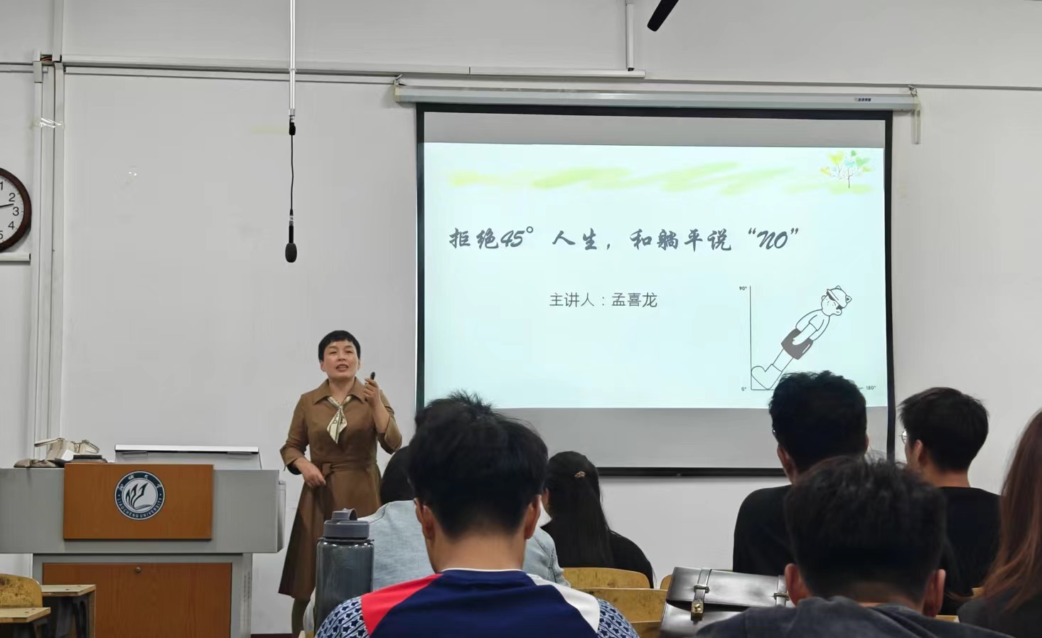 孟喜龙老师以时下很火的词--45°人生、躺平为切入点,讲述45°人是一种什么状态、躺平的缘起以及这些现象的心理学解释。孟喜龙指出想卷卷不动,想躺躺不平,这种不甘平庸又不思进取,清醒的堕落最为可怕,也最尴尬,孟喜龙要求大家现场做一下这个姿势,很累,当然难以为继。