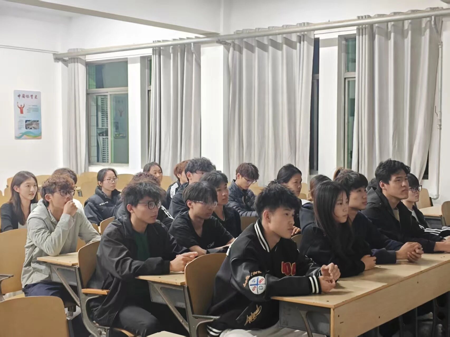 活动前期,工作人员提前准备好《飞驰人生》影片,并完成相关设备的运行检查,确保观影活动顺利开展。活动开始后,工作人员组织同学们有序就座,同时统计到场人数,做好活动前期准备工作。随后,活动负责人正式播放影片,同学们认真观看影片中主角坚守梦想、永不言弃的励志故事,以及赛车运动中的安全规范、团队协作与风险应对情节。观影结束后,同学们踊跃分享观影心得,交流自身对体育精神与拼搏精神的理解。活动最后,工作人员引导到场同学有序离场,并恢复活动场地原貌。
