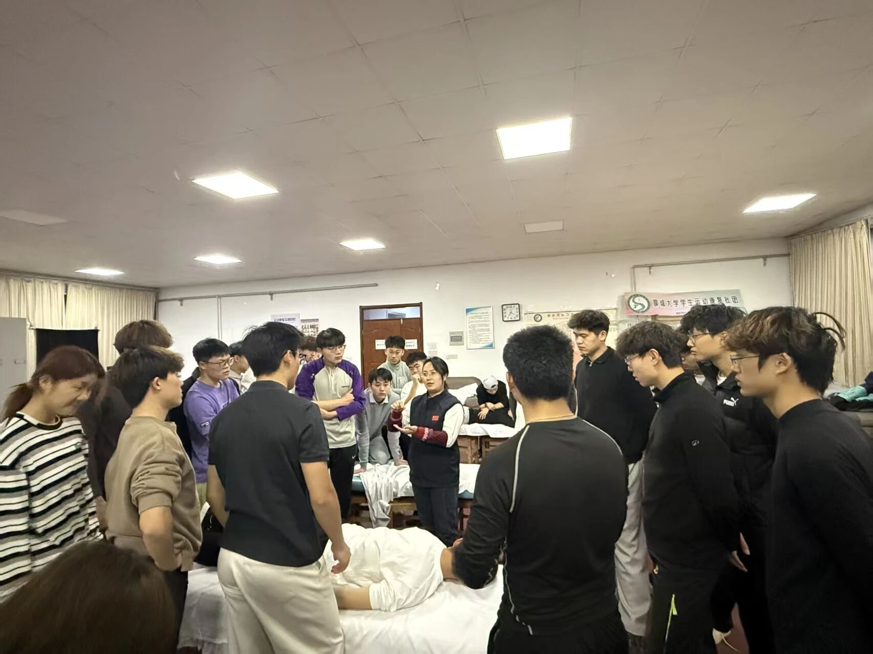 崔梦超结合自身临床实践经验,聚焦同学们在基础按摩手法中常见的发力方式不当、动作规范性不足等问题,采取“理论拆解 + 一对一纠错”相结合的教学方式,系统讲解了动作发力的关键要点、关节角度的控制方法以及安全操作规范。她重点纠正了部分学生存在的肌肉代偿习惯与动作幅度不足等问题,帮助大家从细节上提升操作质量。