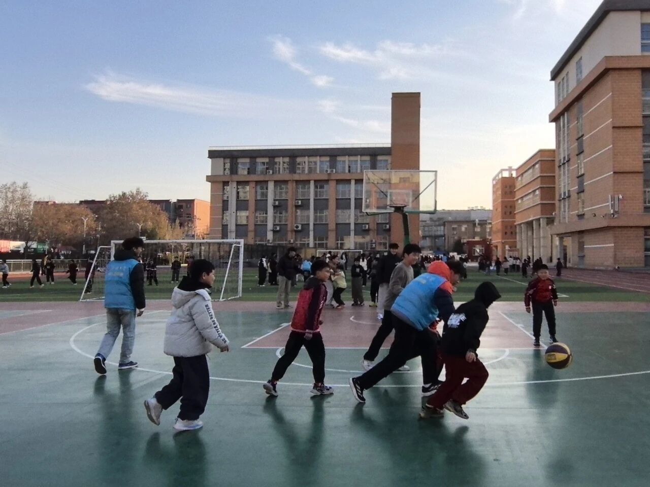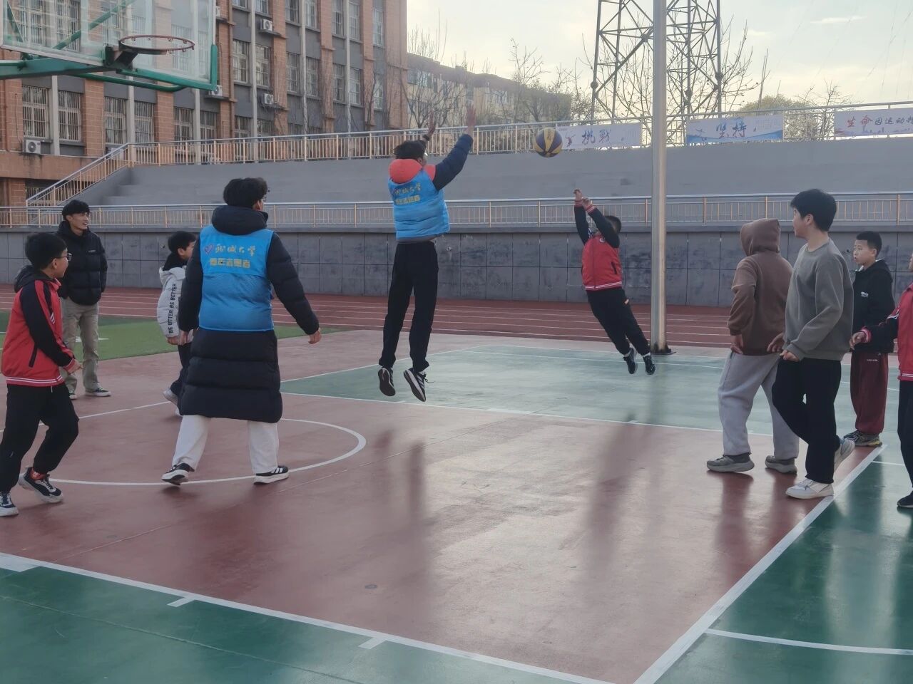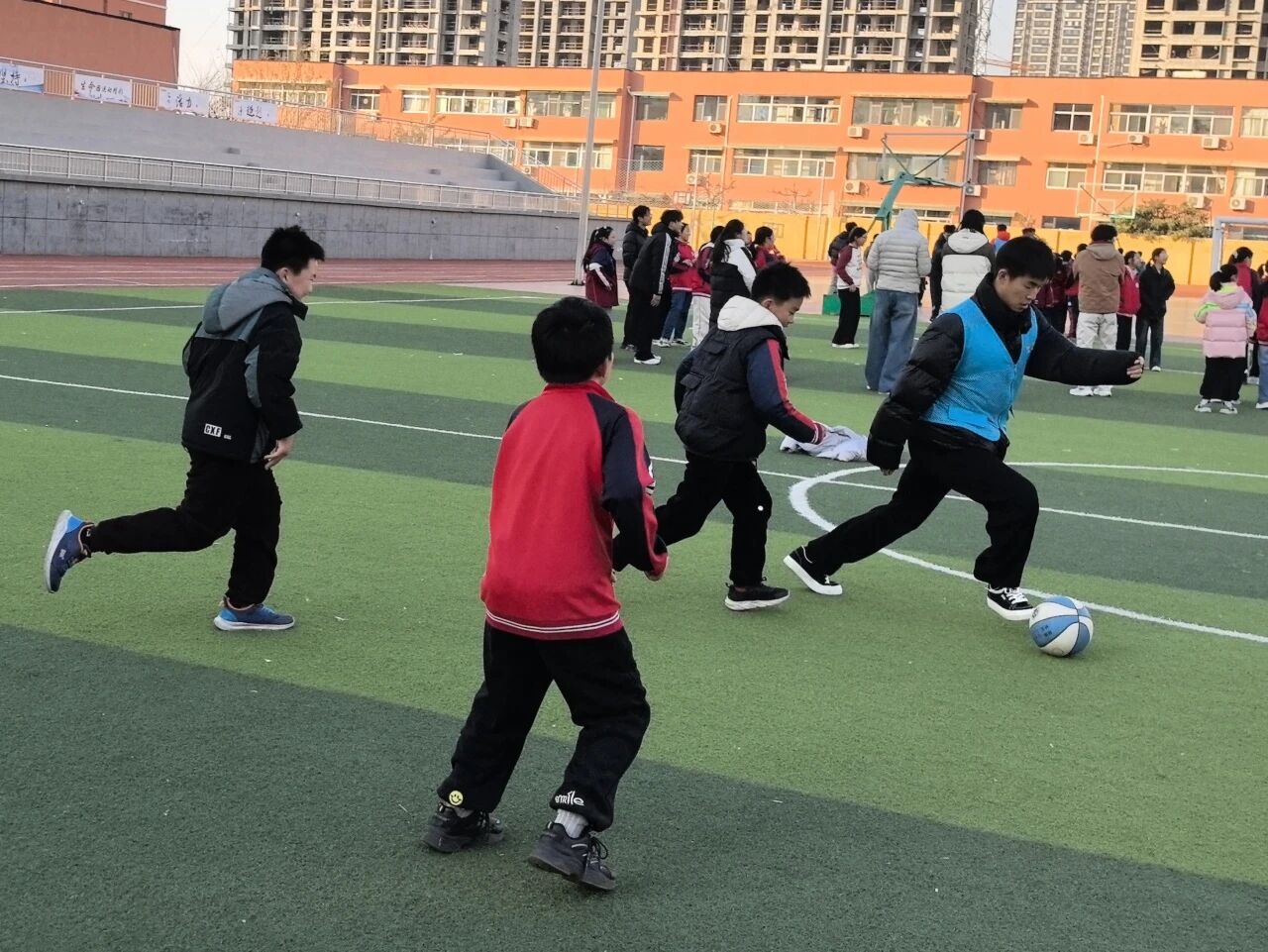 热身激活后,趣味体能训练正式展开:先是跳跃闯关环节,将单脚跳、双脚跳升级为开合跳形式完成基础跳跃训练;随后开启彩虹障碍跑,用标志盘布置障碍赛道,以跑跳结合的方式培养学生肢体协调性;最后进行篮球接力训练,以小组为单位开展“绕圈运篮球”接力——一名学生拍球五下后保持球位,由下一名学生接续,在趣味互动中锻炼平衡感与节奏感,让学生在协作里收获运动乐趣与温暖陪伴。