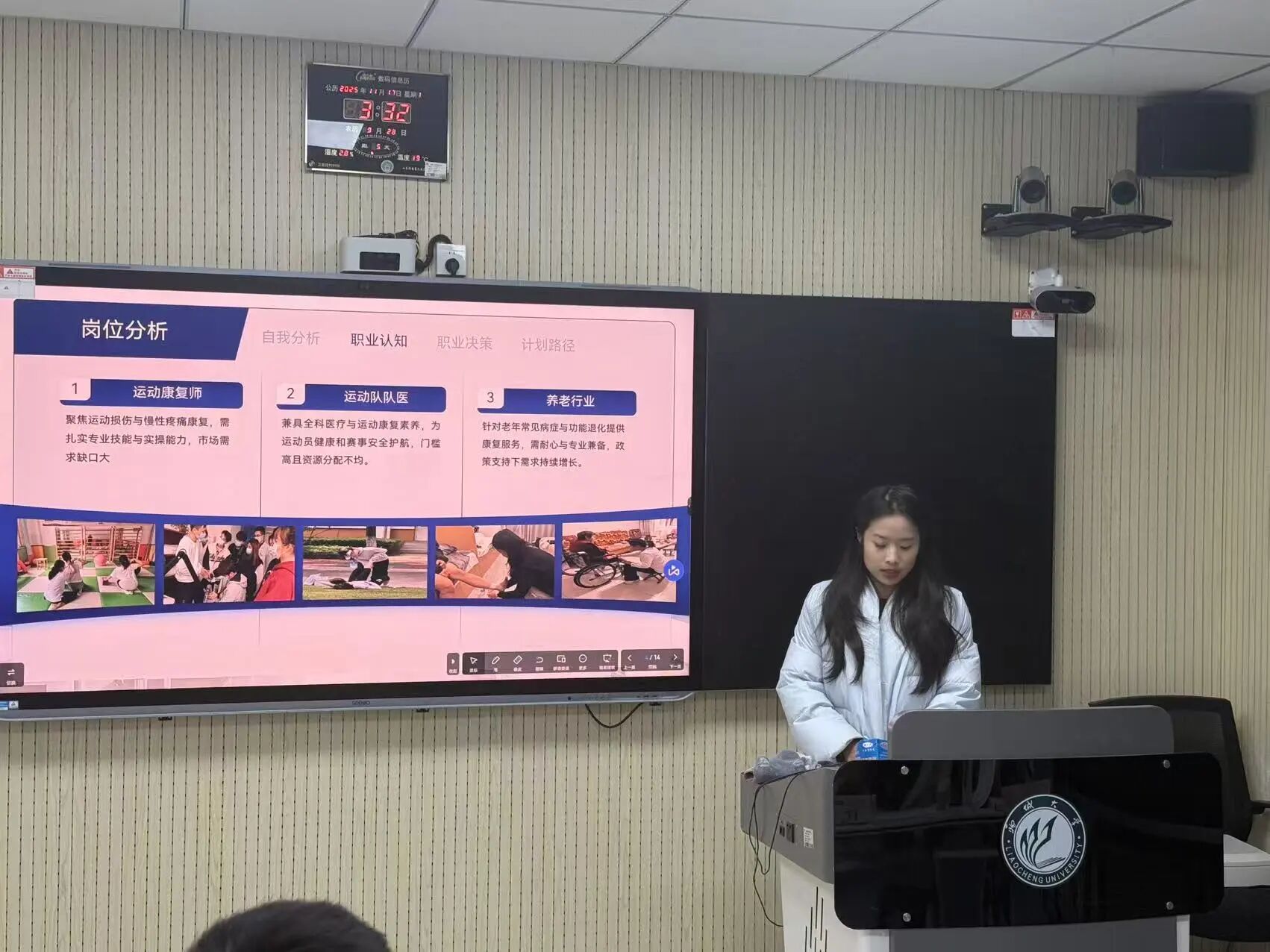 比赛现场,选手们以PPT展示结合现场答辩的形式,紧扣自身专业特长与行业洞察,全面阐述职业规划。从深耕中小学体育教学、守护青少年健康成长,到投身体育赛事策划、打造特色产业IP,再到聚焦运动康复领域、成长为复合型健康服务人才,选手们的规划覆盖体育行业多元赛道,充分彰显新时代体育学子的开阔视野与奋斗决心。各位评委围绕职业定位精准度、实施计划可行性、行业适配性等核心维度对选手作品逐一点评,既精准指出不足、提供改进方向,还结合专业视角为每位选手的职业规划分享见解,助力其明确职业定位。